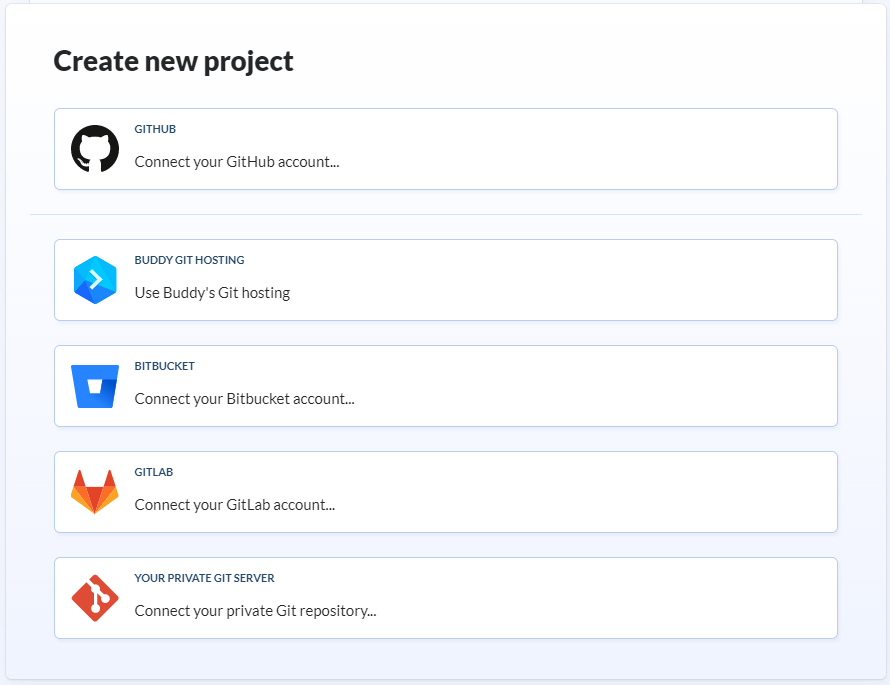 Pour ajouter une CI/CD sur un projet, il faut lier son projet Buddy à un projet Git existant. Ce projet peut être hébergé sur Github, Gitlab, Bitbucket ou un serveur Git privé. Ainsi, lors de la création du projet Buddy, il nous sera demandé de nous connecter à notre projet Git via les différentes options proposées.