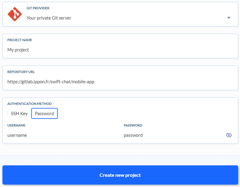 Dans cet article, je vais utiliser un projet Git hébergé sur un serveur privé. Néanmoins, la procédure reste similaire pour les autres choix.