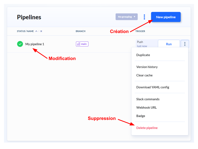 Le premier onglet “Pipelines” permet de gérer les pipelines de la CI/CD. On peut donc créer une pipeline, la supprimer ou la modifier.