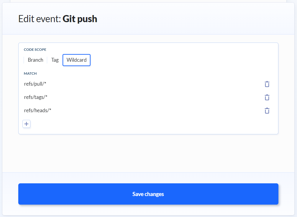 Enfin, pour lancer une pipeline selon des événements Git, il faut choisir l’option “On events”. On peut ainsi définir les événements qui déclencheront la pipeline (un push sur une branche, la création d’une merge request, etc.). Si on veut mélanger plusieurs types d’événements, on peut modifier les paramètres en cliquant sur l’encadré violet associé et mettre les événements voulus dans l’onglet “Wildcard”.