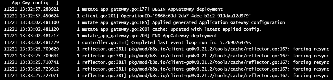 En inspectant plus en détails le pod AGIC et ses logs, on observe que celui-ci se synchronise très régulièrement avec la configuration de l’Application Gateway. A chaque détection d’un nouvel ingress controller, ce pod va recalculer le nouveau template ARM depuis l’existant et appliquer la nouvelle configuration: