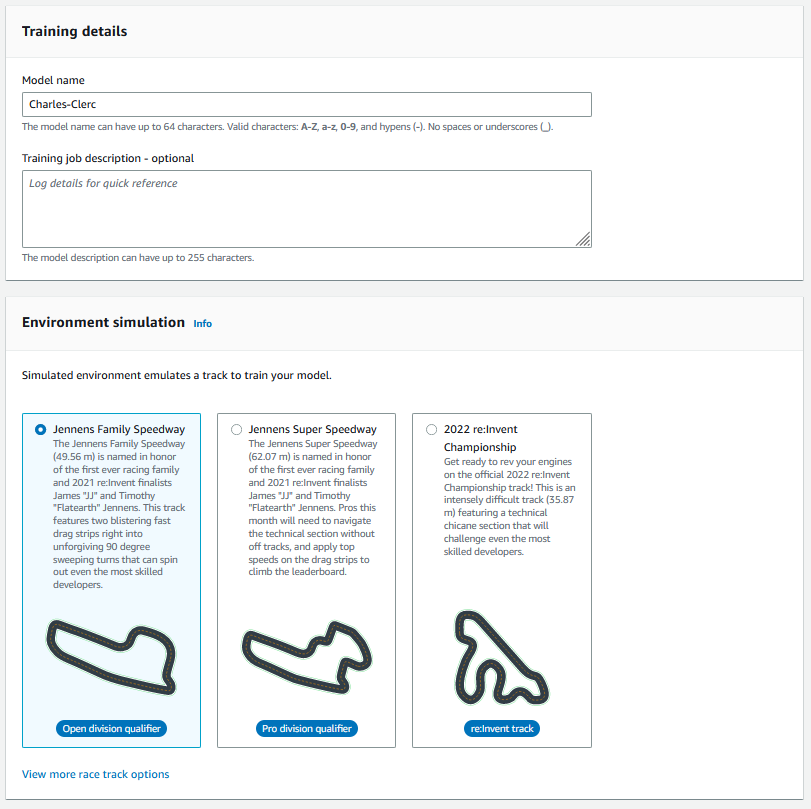 Il est maintenant temps de mettre les mains dans la mécanique, virtuelle bien sûr, mais mécanique quand même. Rendez-vous sur la région us-east-1, unique région où le service est disponible pour l’instant. C’est le moment de créer notre premier modèle, on choisit un nom et un circuit.