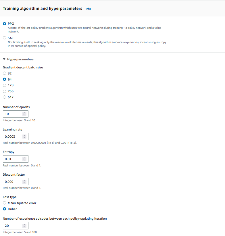 Tout d’abord, que sont les hyperparamètres ? Ce sont tous les paramètres qui permettent de contrôler l'apprentissage du modèle. Ils dépendent du type d'algorithme choisi. Pour l'apprentissage de notre modèle, AWS nous donne deux choix PPO (Proximal Policy Optimization) ou SAC (Soft Actor-Critic).