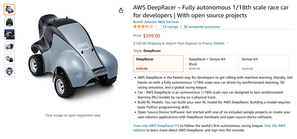 Premier objectif de l’écurie, trouver une voiture. AWS propose un modèle à l’échelle 1/18ème, capable d’embarquer un algorithme d’apprentissage ainsi que des capteurs pour éviter de filer droit dans les virages (spoilers : ça va arriver).