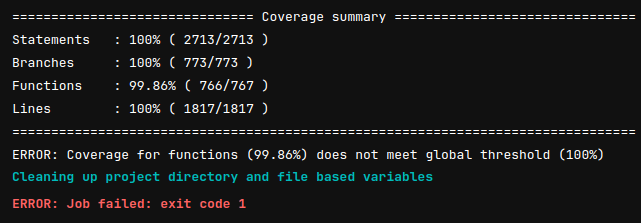 Nous nous assurons par exemple que la couverture de code est à 100%. Si ce n’est pas le cas, cela nous indique qu’il y a sans doute du code mort ou un problème lors d’un refactoring. En effet, cette métrique n’est pas un but recherché en soi, mais davantage d’une résultante de la méthode TDD.