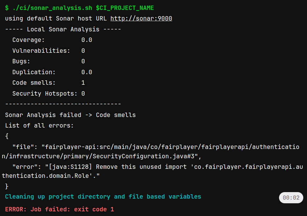 Toujours lors de la CI, Sonar permet de vérifier si le code n’a pas d’imperfections (exemple : code complexe, problème de sécurité, …). Comme vous pouvez le voir ci-dessous, si une seule erreur est détectée par cet outil, la CI se met en échec et nous force à apporter une correction.