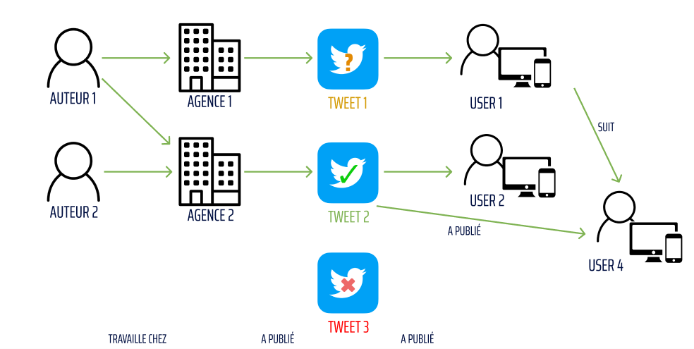 Il apparaît que l’auteur 1 a participé à la rédaction des deux tweets et que l’utilisateur 1 qui a retweeté le tweet 1 suit l’utilisateur 4 qui a retweeté le tweet 2.
