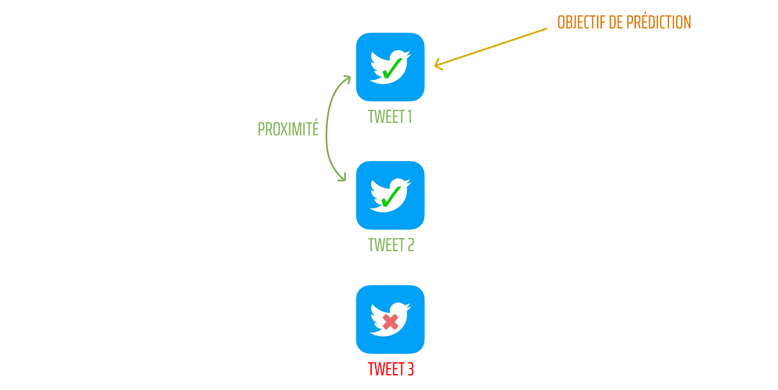 Les 3 tweets considérés ont les propriétés suivantes : un dont l'information est vraie, un dont l’information est fausse et un autre dont on cherche à déterminer sa classification et donc prouver sa véracité ou non. Les tweets ne sont pas classifiés indépendamment les uns des autres, ils influent entre eux.