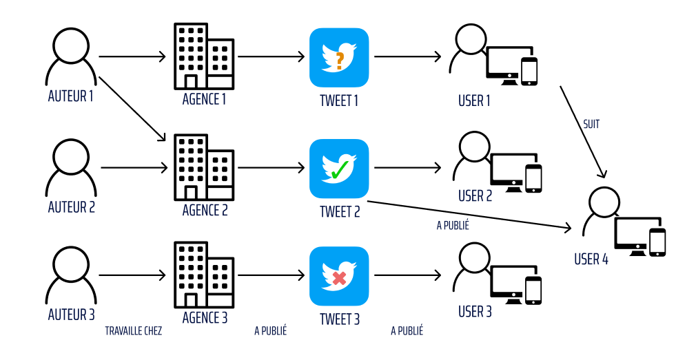 Alors, il est intéressant de faire intervenir une autre méthode d’estimation permettant de qualifier l’information présente dans une publication. Cette fois-ci, au lieu d’analyser le contenu, l’indication porte sur l’analyse du contexte autour de la publication. Le contexte est décrit par les personnes ayant publié ou relayé l’information, ainsi que l’environnement autour de ces personnes : leur travail, leur employeur, leurs relations et bien d'autres.
