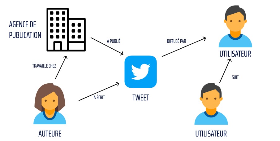 Ce schéma reprend tous les acteurs du contexte social défini précédemment : l’auteure qui a écrit le tweet, l’agence de publication pour laquelle l’auteure travaille, un utilisateur ayant retweeté la publication et un utilisateur suivant l’utilisateur ayant retweeté. Chacune de ces différentes entités représente dans le modèle “Graphe” un nœud. Les liens entre les différents nœuds sont appelés des arcs. Ce sont les principaux objets associés au modèle de données en “Graphe”. Les nœuds sont donc la représentation d’un objet réel et les arcs représentent la relation entre ces différents nœuds.