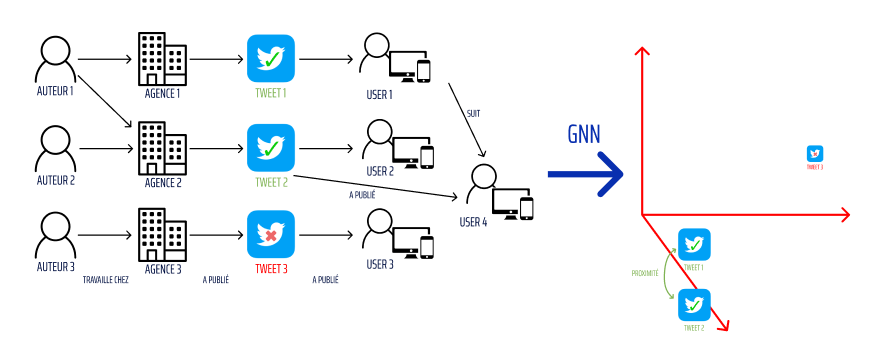 En plaçant ce cas-là dans un GNN (Graph Neural Networks), on peut voir la proximité des tweets sur un plan 3D :