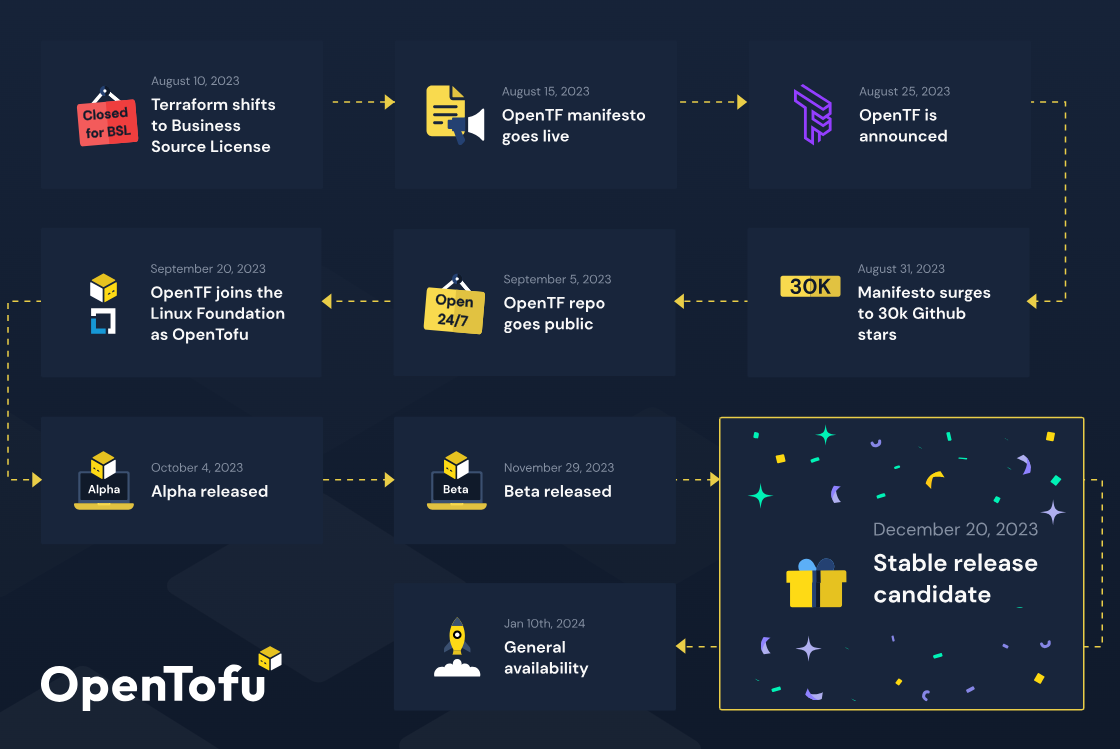 Après 5 mois de travail acharné, la communauté autour du projet OpenTofu a annoncé, dans un article publié sur le site officiel du projet, OpenTofu v1.6.0-rc1 pour le 20 Décembre 2023, une dernière pré-release avant la release officielle pour le 10 Janvier 2024.