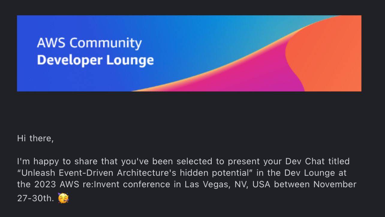 Je vous passe les 2 heures qui ont suivi, j’ai appelé tout le monde, j’étais comme un fou. Me voilà donc speaker à re:Invent 2023 ! BOUM ! Avec en prime, le sujet qui m'intéressait le plus à présenter : les architectures event-driven.