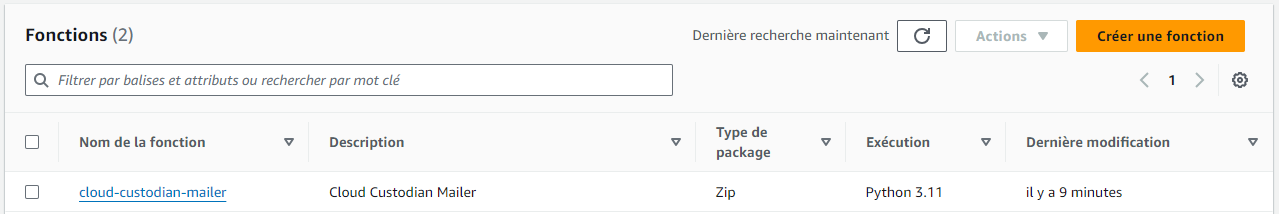 c7n-mailer --config mailer.yaml --update-lambdaEn appliquant cette commande, Custodian va créer la fonction lambda qui sera chargée de récupérer les retours des exécutions de Custodian par les autres fonctions lambda et de les envoyer vers Slack.