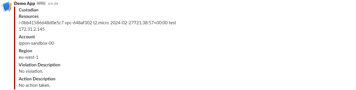 Cet article vise à faire une démonstration de Custodian, les règles ne sont pas forcément les plus judicieuses. Dans ce cas précisément, il serait plus intéressant d’avoir une règle qui permet de tagger automatiquement le nom du créateur de la ressources si celle-ci n’a pas les bons tags et de générer une notification avec une nouvelle règle pour avertir l’utilisateur de son erreur et ensuite planifier un arrêt de l’instance après quelques jours.