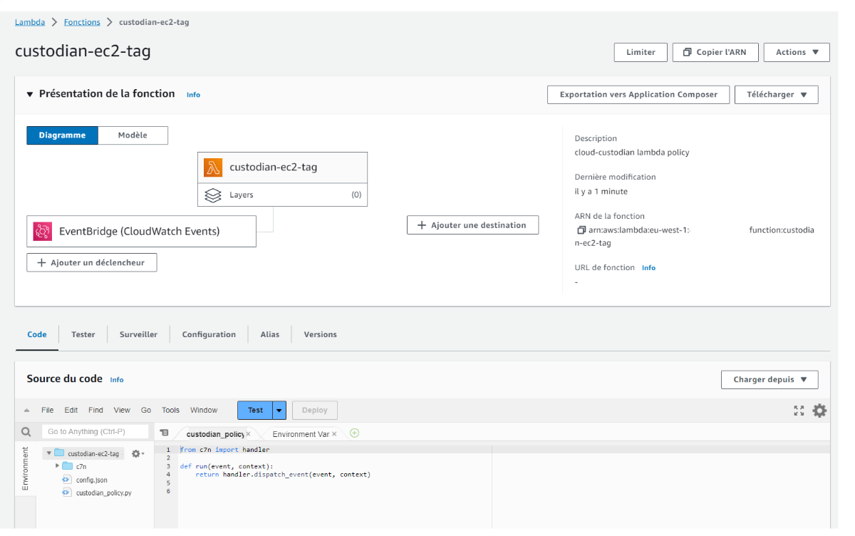 Une ressource Lambda a bien été créée, et si nous créons une instance EC2, celle-ci va bien être détruite par Custodian.