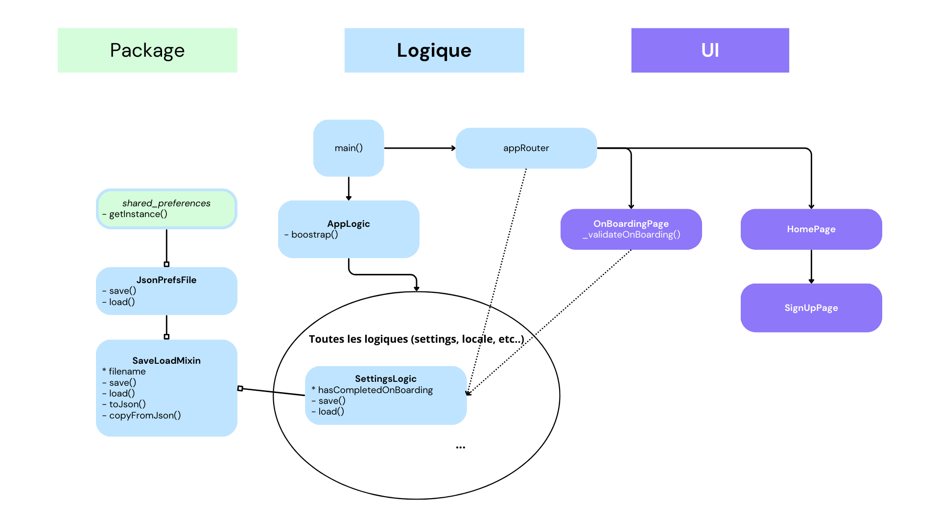 Nous créons AppLogic qui servira de gestionnaire de tous les services de l’application et s’occupera de les initialiser. Puis nous créons le service SettingsLogic qui s’occupera de toutes les préférences utilisateurs, dont s'il a complété le onboarding ou non.