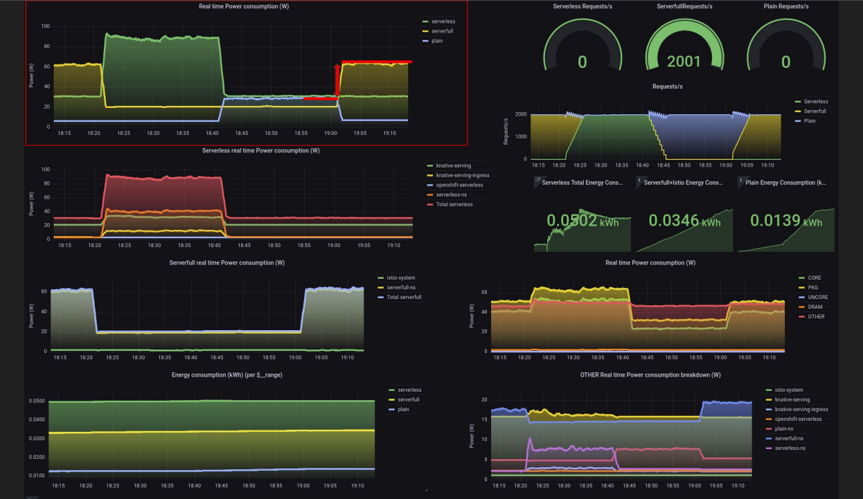 - L’énergie consommée par les ressources KNative est équivalente à celle des ressources de la solution serverless.