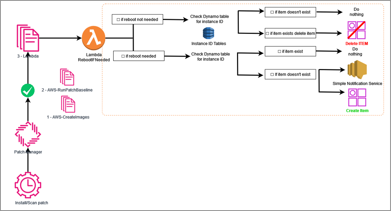 Après que les deux premières Tasks se soient effectuées, vient l’étape où l’on fait appel à une lambda dans lequel on envoie des métadonnées. Dans ces métadonnées on récupère l’instance id, sur lequel on pourra faire des actions de vérification de statut. Ainsi, si l’instance est en attente de reboot, une notification sera envoyée et l’instance sera inscrite dans un “item” de dynamoDB. Ceci nous permettra de ne pas envoyer de notification tous les jours à l’équipe responsable du reboot de cette même instance si son statut ne change pas.