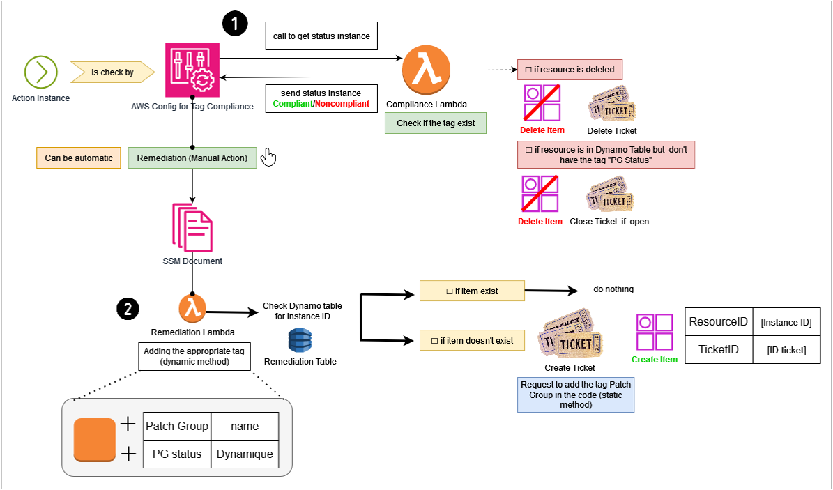 AWS Config peut être personnalisé par une lambda. Cette lambda peut faire une vérification des tags et donner un statut de conformité aux instances avec une description. Config permet ensuite d'appliquer une remédiation (automatique ou manuelle). Cette remédiation est aussi personnalisée par une seconde lambda dans laquelle on va pouvoir, en plus d'ajouter des tags, interagir avec un outil de ticketing afin de faire une demande aux équipes concernées de mettre le tag dans le code.