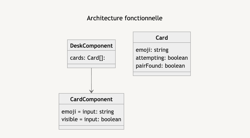 Concernant l’architecture, on peut s’imaginer un composant desk qui appelle toutes les cartes dans une boucle for. Toutes les informations seront regroupées dans la variable cards qui sera un tableau contenant toutes les cartes.