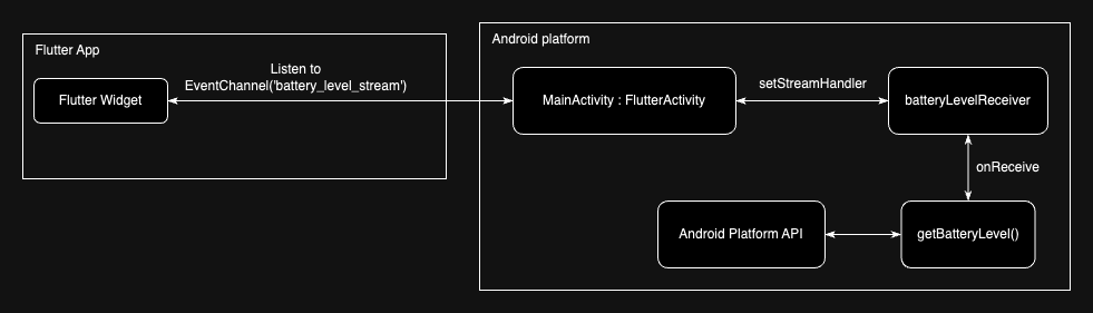 Dans cet exemple, on ne récupère pas de données de manière ponctuelle mais en temps réel. Utiliser un MethodChannel n’est donc pas adapté puisqu’il permet uniquement de faire appel à une méthode puis d’en récupérer le résultat à un instant T.