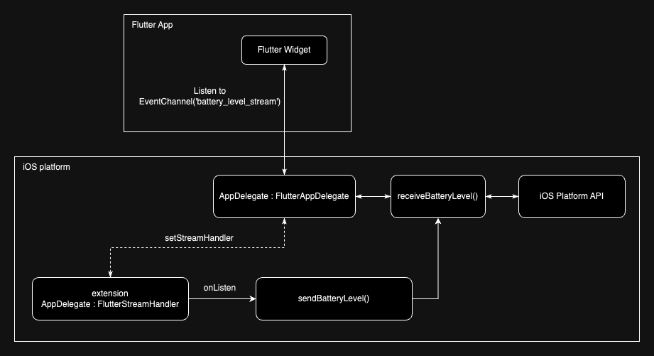 Ensuite, on assigne AppDelegate comme le gestionnaire du flux de données continu. Cela permet à la partie native iOS d'envoyer des données vers Flutter sous forme de stream.