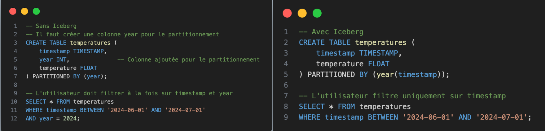 Iceberg simplifie l'utilisation des données partitionnées grâce à son concept de Hidden Partitioning. En général, pour partitionner des données temporelles de type timestamp, il faut créer une nouvelle colonne year, month ou day et les utilisateurs doivent explicitement l'utiliser dans leurs requêtes. Iceberg adopte une approche différente en définissant directement des fonctions de transformations de partitionnement sur les colonnes existantes et en stockant ces informations dans ses métadonnées. Ainsi, une requête filtrant sur une date bénéficie automatiquement du partitionnement par année sans que l'utilisateur n'ait à connaître ou à utiliser une colonne spécifique.