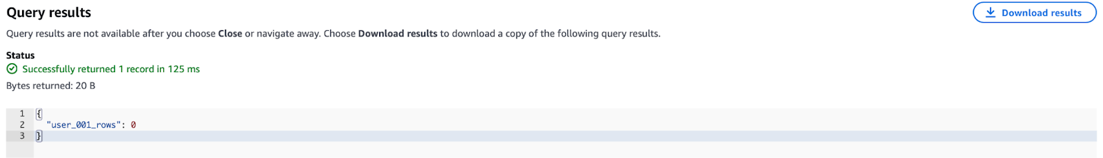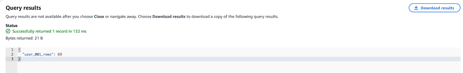 Nous pouvons interroger le fichier et constater que 69 lignes liées à l'utilisateur 'user-001' sont présentes.