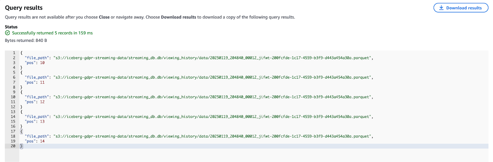 Ce dossier contient notre delete file. En l'ouvrant, nous pouvons voir toutes les positions des lignes contenant les données de Marie dans notre fichier Parquet.