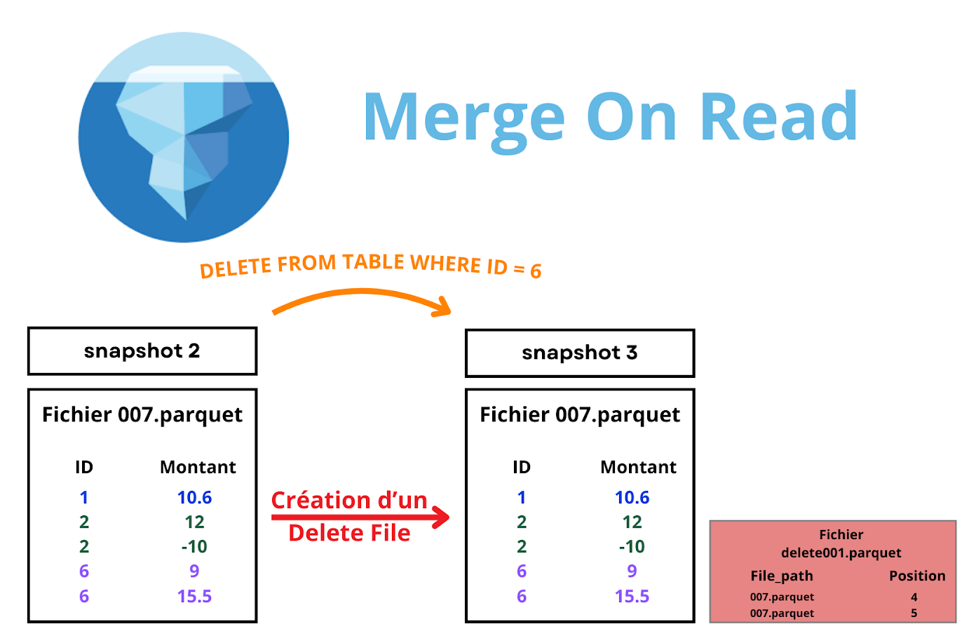 1. Un DELETE FROM table pour supprimer la donnée de la table, ce qui génère le delete file.