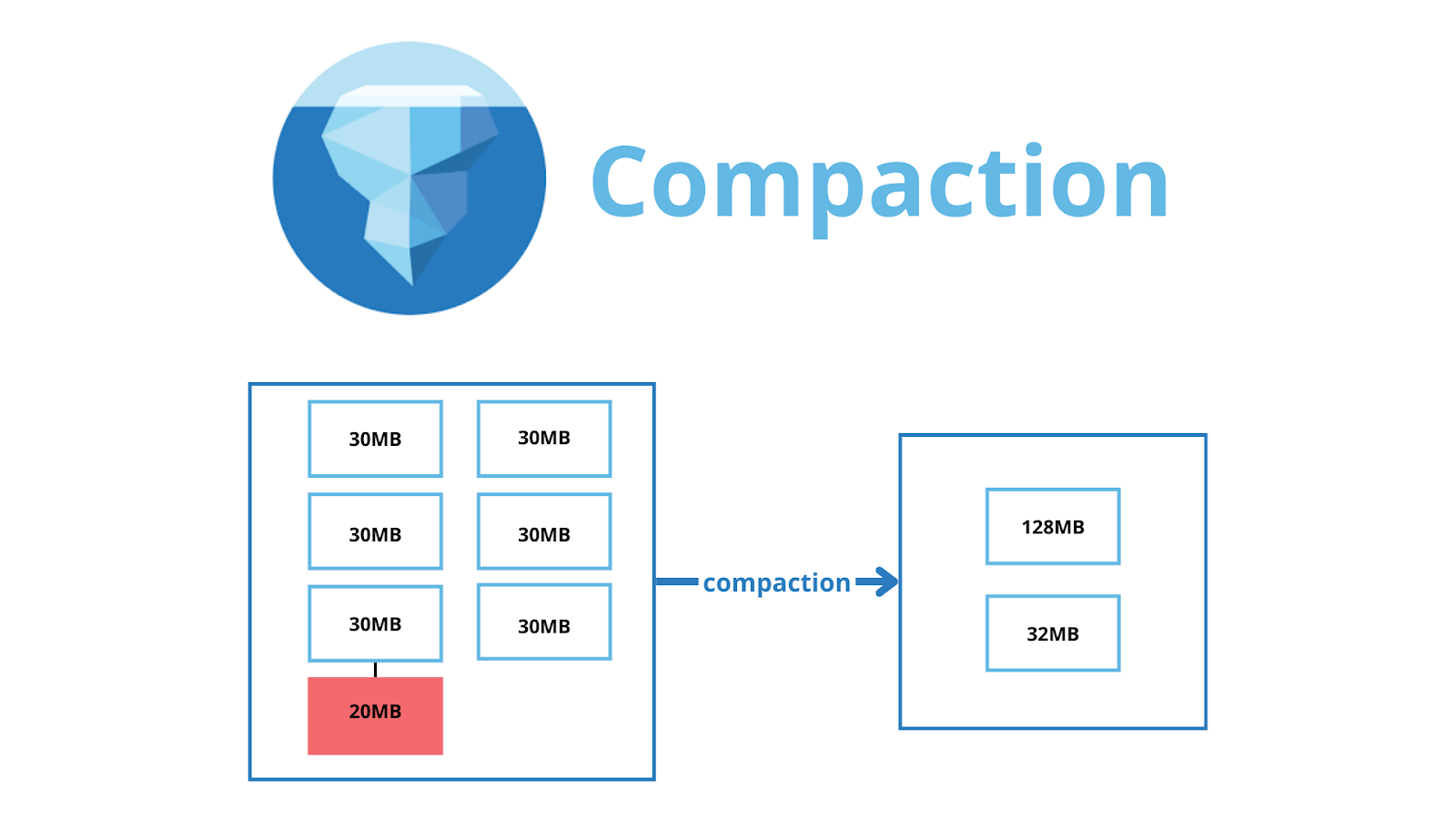 L’opération qui permet de fusionner physiquement les delete files avec les fichiers de données auxquels ils sont rattachés est appelée Compaction. Cette fonctionnalité permet de prendre en compte la suppression des données au niveau des fichiers (et pas seulement à la lecture de la table) mais également d’éviter de se retrouver avec une multitude de petits fichiers, optimisant ainsi nos requêtes. En effet, en fusionnant les petits fichiers en fichiers plus volumineux, cela réduit le nombre d'opérations d'accès aux fichiers lors des requêtes. Cette fonctionnalité est très utile dans notre cas d’usage RGPD pour s’assurer que le fichier de données soit bien réécrit sans les données à supprimer.