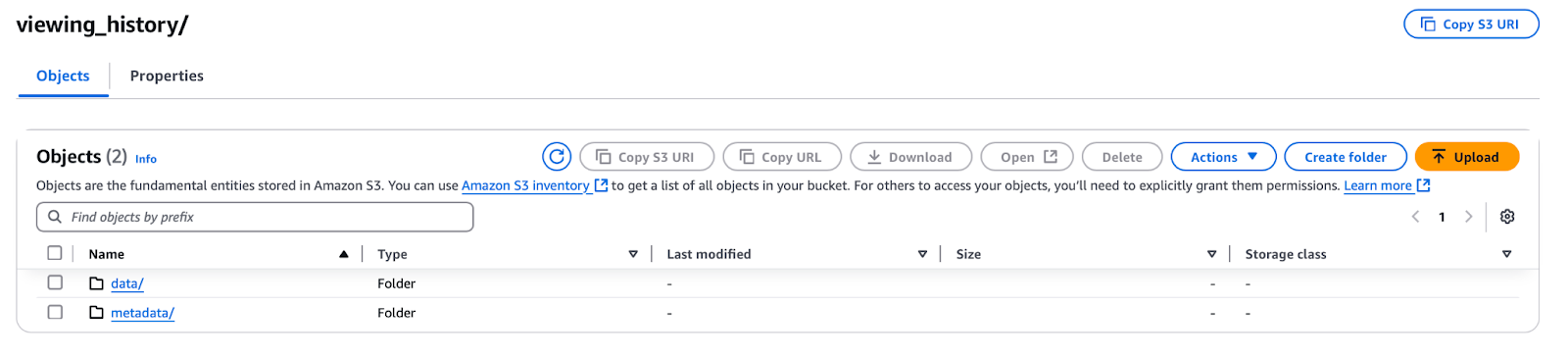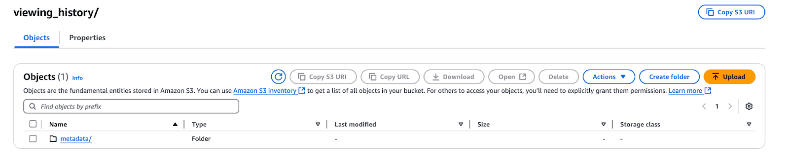 Lors de la création de la table viewing_history, un dossier metadata est généré, contenant le fichier de métadonnées.