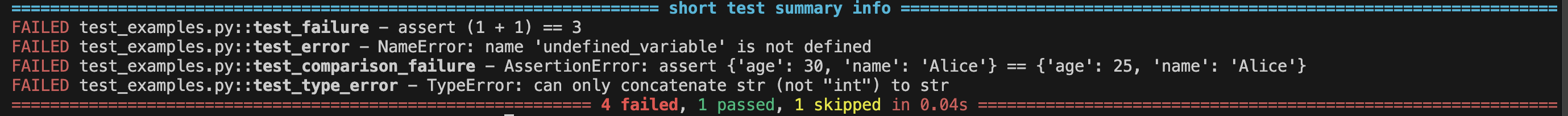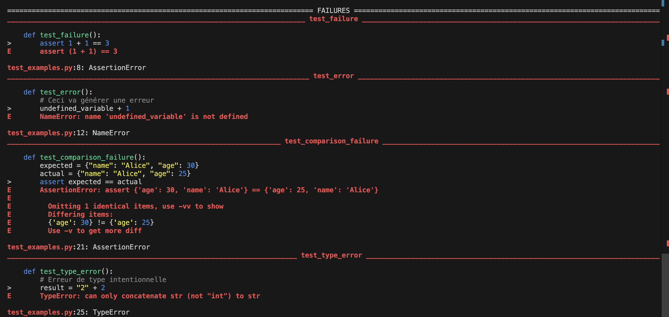 Un des grands avantages de pytest est la qualité de ses retours. Pour chaque test, vous obtenez :