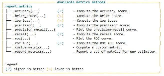 Heureusement, skore nous simplifie la vie grâce à la classe EstimatorReport qui, lorsqu’on lui fournit le modèle à évaluer ainsi qu’un dataset d’évaluation, nous met alors à disposition tous les résultats d’évaluation pertinents vis-à-vis de notre tâche. Par exemple, avec la méthode .help() pour le code précédent, on peut voir que l’on a accès à l’ensemble des métriques suivantes :