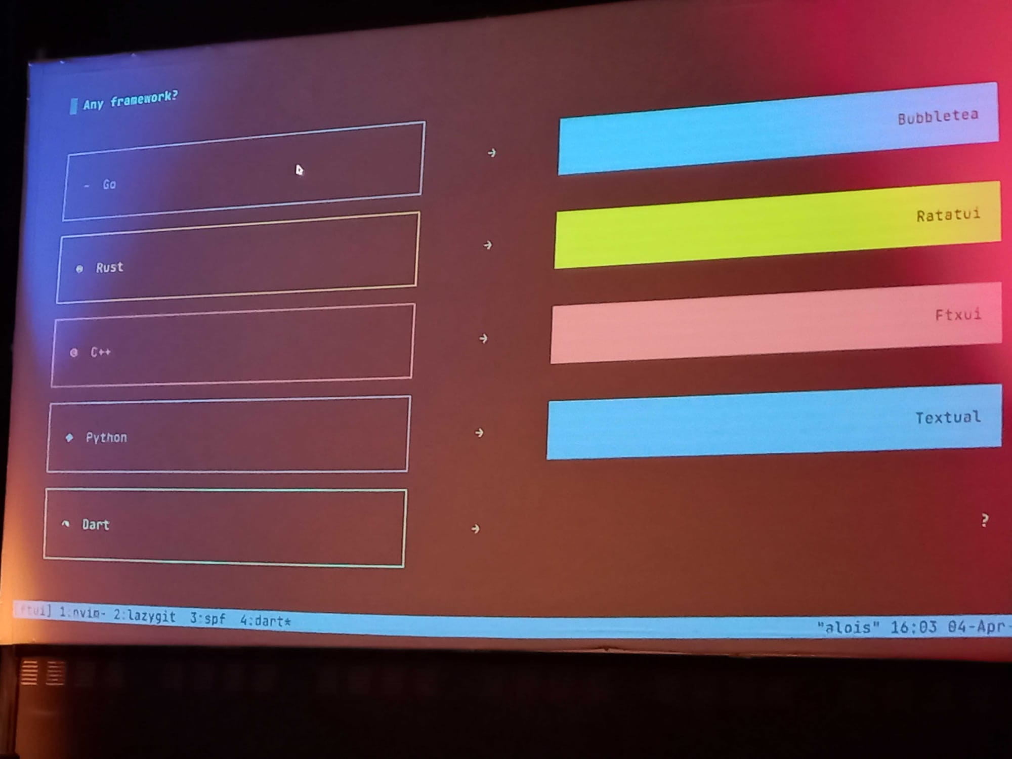 Plusieurs frameworks proposent déjà ce genre d’approche dans d'autres langages — comme Bubbletea en Go, Ratatui en Rust ou encore Textual en Python. Jusqu’ici, Dart ne disposait d’aucune solution équivalente. FTUI vient donc combler ce vide, en posant les bases d’une interface terminal native pour l’écosystème Flutter.