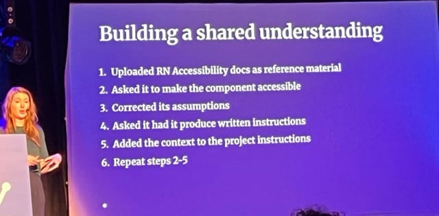 90 millions d’européens sont touchés par une déficience visuelle. Britta nous propose à travers son expérience personnelle une exploration de l'utilisation de l'intelligence artificielle afin d’améliorer l'accessibilité dans les applications React Native, en vue de se conformer aux exigences de l'European Accessibility Act qui pour rappel sera instauré à compter du 28 juin 2025.Britta nous détaille par l’exemple comment l’IA peut nous aider à rendre nos applications plus accessibles au travers d’un mini projet à condition de bien préciser nos attentes car par défaut le code proposé ne tiendra pas compte des normes d’accessibilité. Les délais étant courts pour les entreprises qui n’auront pas anticipé ce jalon, cette aide appréciable est une opportunité d’améliorer aisément l’accessibilité de leur app. Son conseil principal : CONTEXTUALISER ! Et en premier lieu, scinder les fonctionnalités / groupes d’écrans afin de travailler sur un périmètre clairement identifié et logique. Faire ensuite un première review qui permet à l’IA de décrire le fonctionnement et poser le contexte puis, avec les inputs adéquats concernant les guidelines d’accessibilité, relancer un prompt afin d’obtenir les recommandations A11Y. Ne pas hésiter à tester différents clients.
