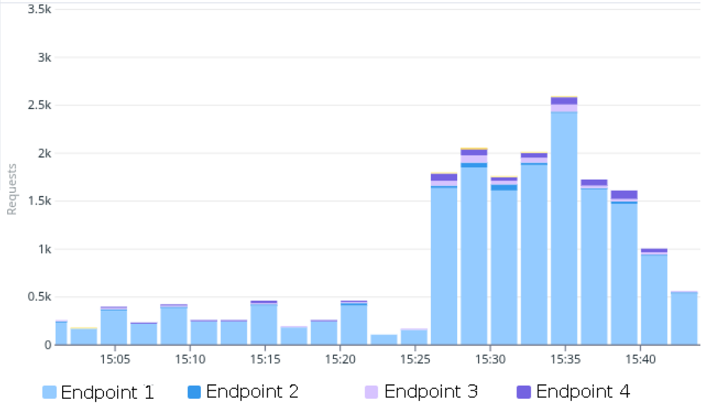 Le monitoring technique repose principalement sur l’analyse des appels aux différents endpoints utilisés pour la création de comptes. En raison de la présence de code legacy, plusieurs endpoints coexistent encore, chacun étant intégré à un dashboard spécifique indiquant le volume d’appels dans le temps. Ce suivi permet d’identifier rapidement une baisse d’activité ou un comportement anormal. A titre d’exemple, je vous transmets un de nos dashboard d’une fonctionnalité avec plusieurs endpoints sous la forme de graphe cumulé du nombre d’appels à chaque endpoint en fonction du temps :