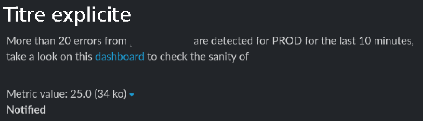 Parallèlement, nous avons mis en place un système d’alerting temps réel via notre outil de communication interne et email. Chaque alerte doit être compréhensible immédiatement : elle inclut un titre explicite, précisant l’indicateur concerné, le niveau d’alerte, ainsi qu’un lien direct vers le dashboard associé pour permettre une investigation rapide.