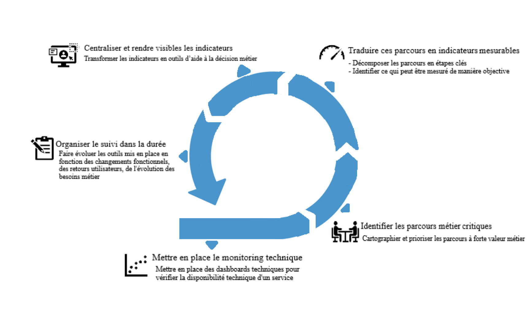 Une fois les parcours métier identifiés, il s’agit de les décomposer en étapes clés et d’identifier ce qui peut être mesuré de manière objective. Le but : obtenir des indicateurs concrets, compréhensibles et exploitables par les métiers comme par les équipes techniques.