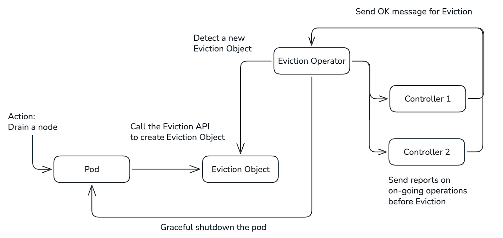 Pour rendre la maintenance des nœuds moins disruptive, une nouvelle API est en cours de développement : Eviction Request.Contrairement à l’ancienne méthode, qui supprimait le pod instantanément, cette API crée une “intention” observable. Ainsi, l’Eviction Request Operator peut détecter cette demande, et dispose d’un lapse de temps pour déplacer les données présent sur le node en toute sécurité. Il crée des Controllers qui lui font des rapports en temps réel sur le statut de ces opérations. Une fois terminé, les controllers envoient un signal à l’Eviction Request Operator qui requête l’API d'Éviction pour supprimer proprement le Pod.