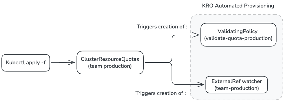 On passe alors d’un modèle où la définition du Quota pour chaque équipe se fait par namespace, à une configuration où la seul définition de la ressource ClusterResourceQuotas (définie dans le RGD), va permettre la création des ResourceQuotas dans chaque namespace appartenant à une équipe, et de centraliser leur gestion. Kyverno vient ensuite automatiquement valider ou refuser la modification des ResourceQuotas, garantissant un respect des règles de ressources définies pour chaque équipe.