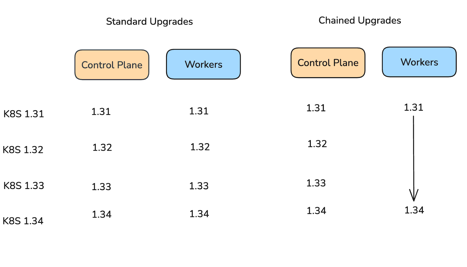 Une nouvelle fonctionnalité à également été ajoutée dans les versions récentes de Kubernetes, permettant de fluidifier la mise à jour des versions de Kubernetes déployées sur les nœuds. Il s’agit du Chain Upgrades, qui permet d’augmenter réduire le nombre de redémarrages nécessaires pour passer d’une version X à une version Y. Cela fonctionne en deux étapes : admettons que notre cluster soit en version 1.31, et que l’on souhaite faire la mise à jour vers la version 1.34.